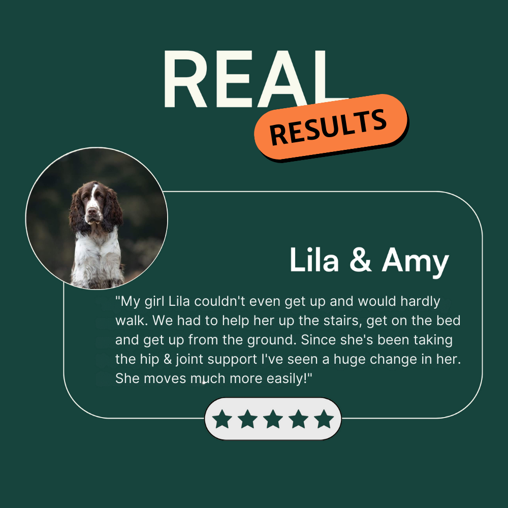 One chew a day and longer countryside loops feel doable again. He hops into the boot without the little “help me” look and settles quicker once home.